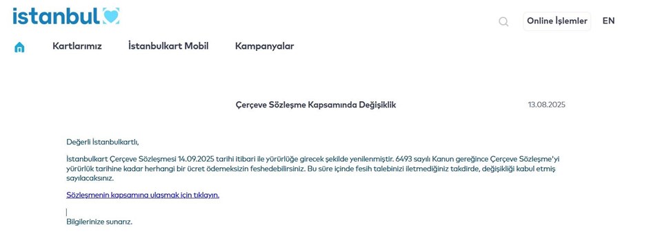 İstanbulkart Çerçeve Sözleşmesi’nde 14.09.2025 tarihi itibari ile yürürlüğe girecek şekilde değişiklik yapıldı. Resmi kaynaklardan yapılan açıklamada; “İstanbulkart Çerçeve Sözleşmesi 14.09.2025 tarihi itibari ile yürürlüğe girecek şekilde yenilenmiştir. 6493 sayılı Kanun gereğince Çerçeve Sözleşme’yi yürürlük tarihine kadar herhangi bir ücret ödemeksizin feshedebilirsiniz. Bu süre içinde fesih talebinizi iletmediğiniz takdirde, değişikliği kabul etmiş sayılacaksınız.” denildi.