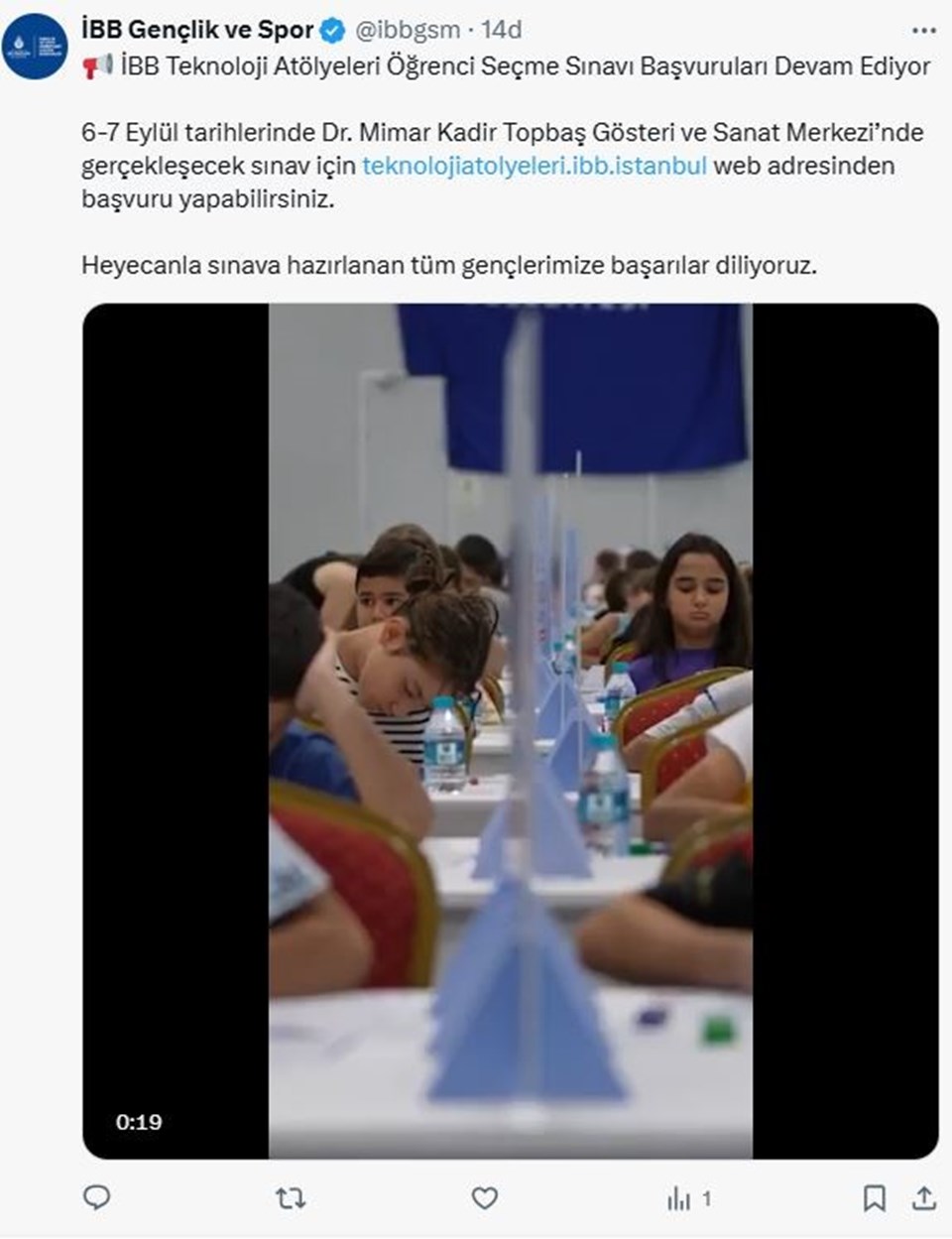 Yapılan açıklamada; “İBB Teknoloji Atölyeleri Öğrenci Seçme Sınavı Başvuruları Devam Ediyor