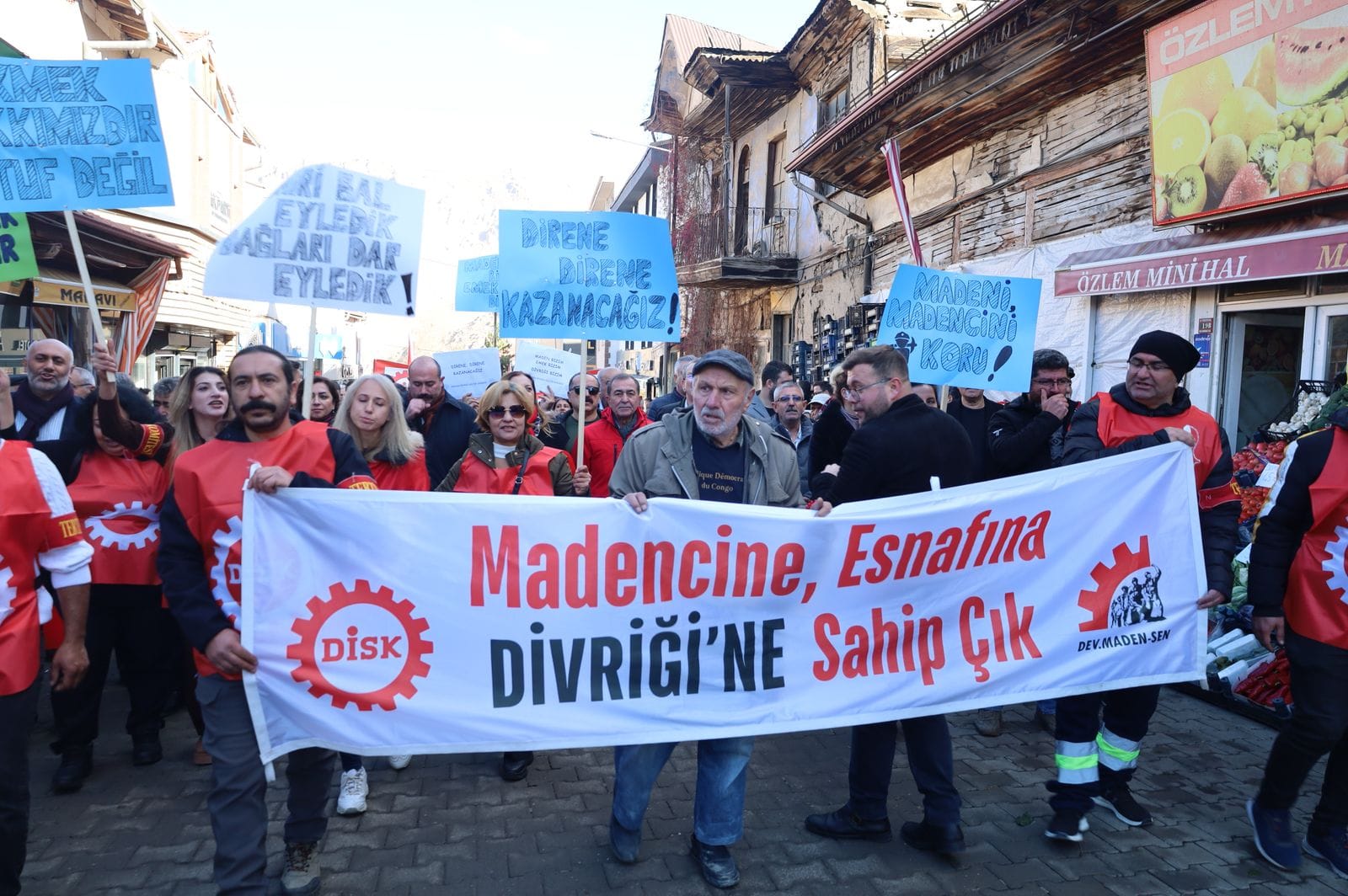 DİSK Genel Başkanı Arzu Çerkezoğlu, Divriği Belediye Başkanı Cihan Deniz Akbaş, DİSK Genel Sekreteri Tayfun Görgün, DİSK İç Anadolu Bölge Temsilcisi Birgül Kaya, DİSK/Dev Maden-Sen Genel Başkanı Ahmet Remzi Atasoy, demokratik kitle örgütleri ile ilçe halkının katıldığı yürüyüşte Oyak Holdinge bağlı Erdemir ve Ermaden şirketleri protesto edildi. Divriği Madenci Yürüyüşü’nde işçiler, “İnadına Sendika, İnadına DİSK” sloganları attı.
