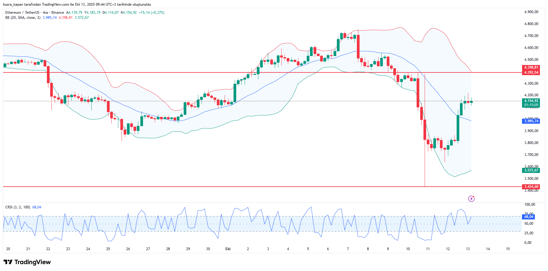 ALtcoinler grubunun en büyüğü olan Ethereum, 4 bin 400 dolar seviyesinden sert düşüşler yaşayarak 3 bin 434 dolar seviyesine kadar geriledi.  Verdiği kayıpları toparlamaya çalışan Ethereum, bugün sabah 09.38’de 4 bin 153 dolarda bulunuyor.